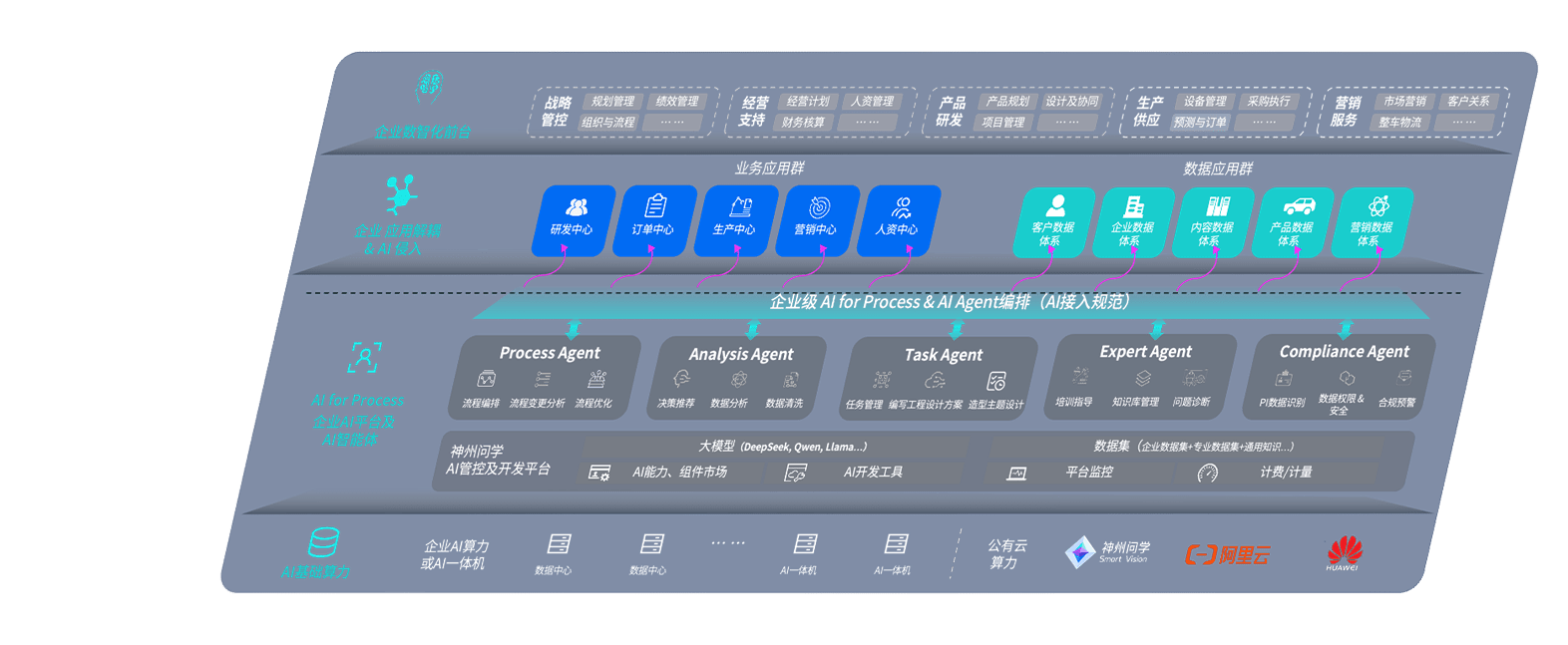 端到端的一站式AI工作空间深度融合了从企业战略规划到日常经营的全流程业务板块,,,,定向解决车企内部领域多、、部门多、、、、链条长、、场景碎片化等难题,,支持车企快速构建以AI为核心的生产力写作体系,,实现任务执行与AI能力的无缝集成与交互