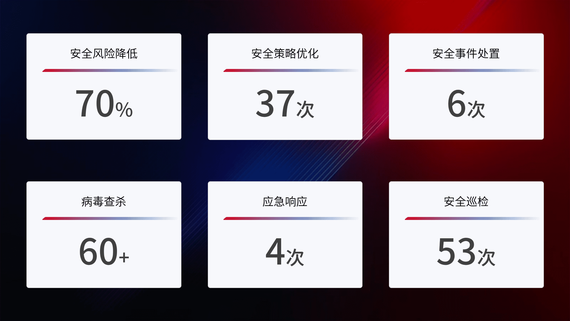 提供全面的安全事件报告体系,,,,包括处置报告、、、、周报、、、、季度和年度总结,,,结合持续监控,,,帮助客户深入了解网络安全状况。。